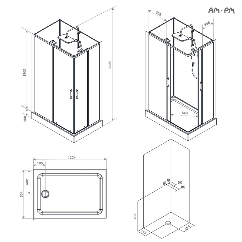 Душевая кабина 120x90 AM.PM Above W9XC-403-12090BT профиль черный матовый, низкий поддон