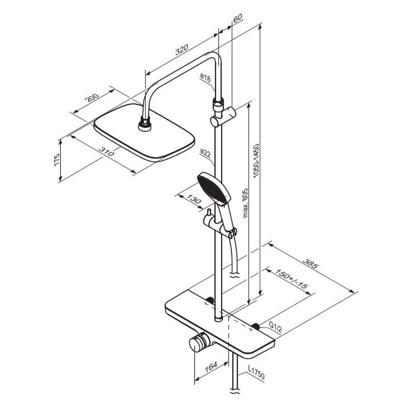 В комплектацию душевой системы входят: тропический душ, ручной душ, термостатический смеситель, эксцентрики, держатели штанги и душа. Длина душевой штанги - 1030-1460 мм. Длина душевого шланга - 1500 мм. Размер ручного душа - 120/25 мм. Диаметр верхнего душа - 230 мм.