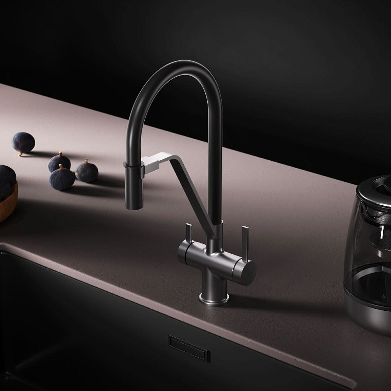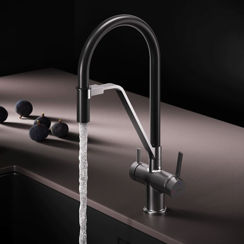 Смесители Смеситель для кухни AM.PM Func F8F07812 высокий, сатин с каналом для питьевой воды и гибким черным изливом купить в Москве.