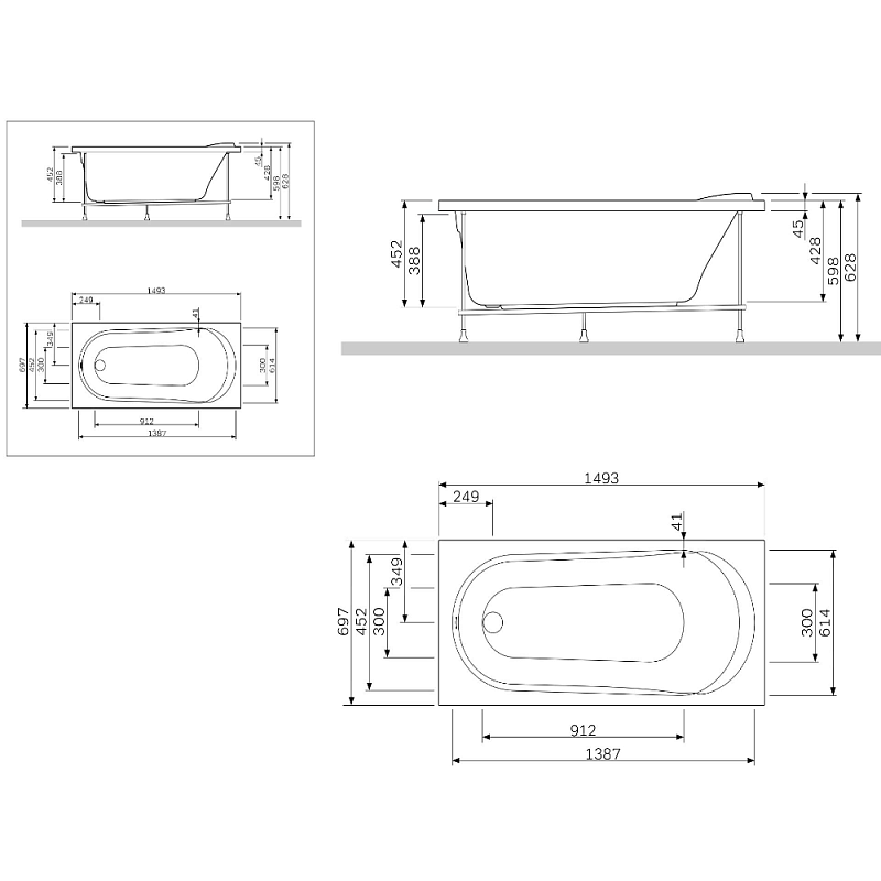 Допуск на отклонение фактического размера акриловых комплектующих, относительно заявленных на чертеже +/- 7 мм на 1 погонный метр. Размеры помещения под установку ванны должны обеспечивать технологический зазор +5 мм с каждого борта ванны (для учета линейных расширений материала под воздействием температуры и веса воды).